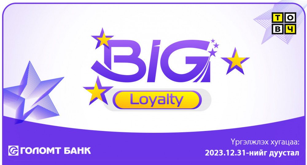 Голомт банкны харилцагчдын тогтмол хэрэглээг урамшуулах зорилготой Big Loyаlty оноотой хөтөлбөр дахин хэрэгжиж эхэллээ. Энэ хөтөлбөрийн хүрээнд та 2023.12.31-нийг дуустал Голомт банкны бүтээгдэхүүн, үйлчилгээг ашиглах бүрдээ оноо цуглуулж, төрөл бүрийн урамшуулалд хамрагдаарай. Та өөрийн цуглуулсан оноог хамтран ажиллаж буй байгууллагуудын купон авах эсвэл автомашин болон 1 өрөө орон сууцны шагналтай урамшуулалд оролцох гэсэн 2 хэлбэрээр зарцуулах боломжтой.