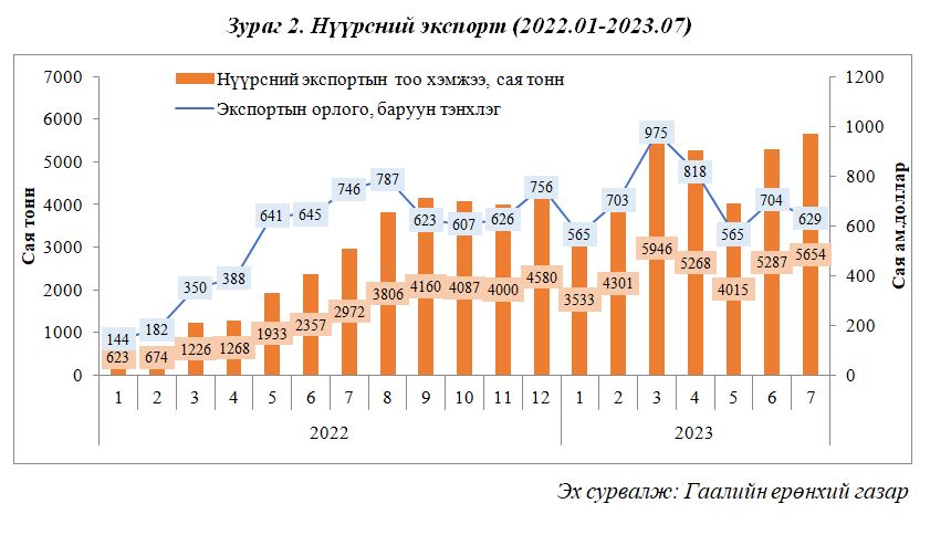 Монгол Улс жилийн өмнө буюу 2022 оны эхний 7 сард дунджаар 1.6 сая тонн нүүрс экспортолж байсан бол 8-12 дугаар сард дунджаар 4.1 сая тонн нүүрс экспортолж 2022 онд нийт 31.7 сая тонн нүүрс экспортолж, экспортын орлого 6.5 тэрбум ам.долларт хүрч байсан юм.