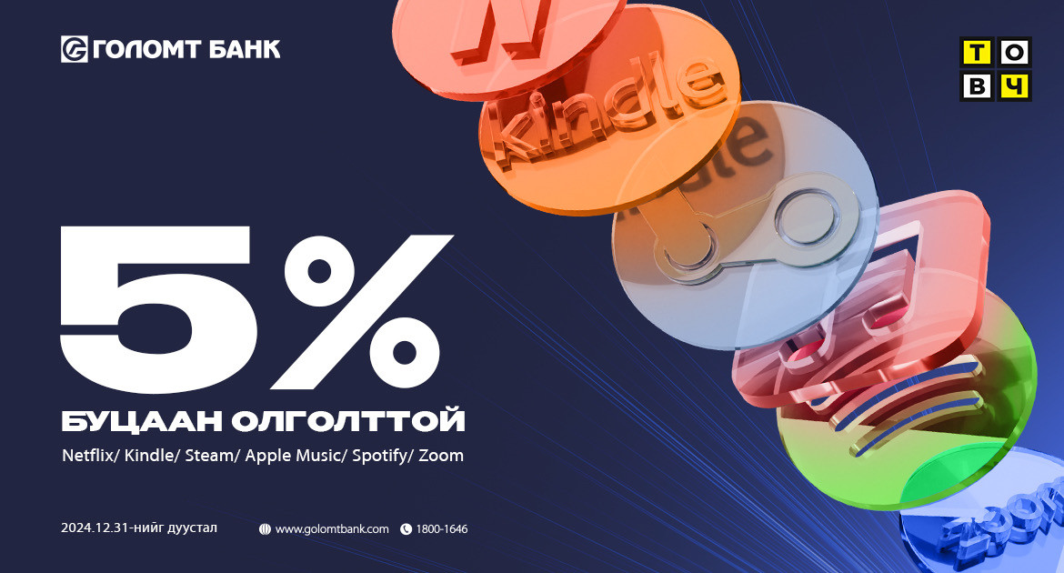Та 2024.03.20-2024.12.31-нийг дуустал 8 сарын туршид дараах платформуудын subscription төлбөрийн хэрэгсэлд Голомт банкны Visa, Mastercard брэндийн кредит картууд болон SocialPay аппликэйшний бүх төрлийн виртуалкартаа холбон төлбөр төлөөд 5%-ийн буцаан олголт авах боломжтой.