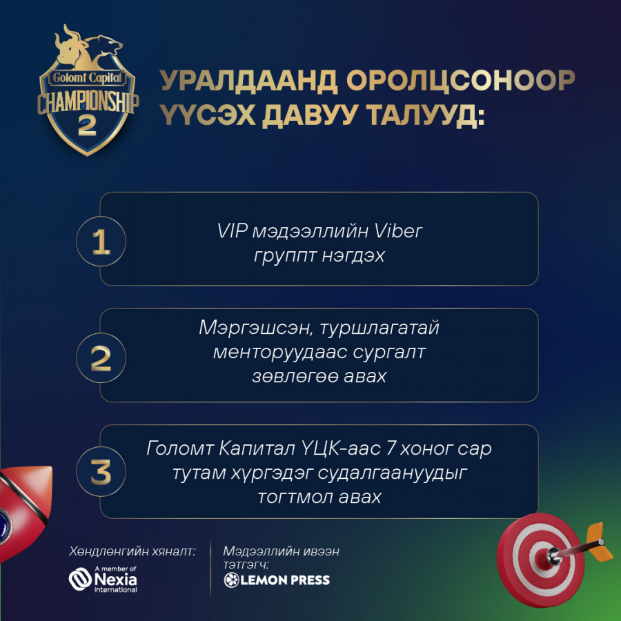 Тэгвэл энэ удаад зохион байгуулагдах “GОLOMT CAPITAL CHAMPIONSHIP-2” гадаад арилжааны уралдааны ялагчаар 3 хүн тодруулахаараа онцлогтой.