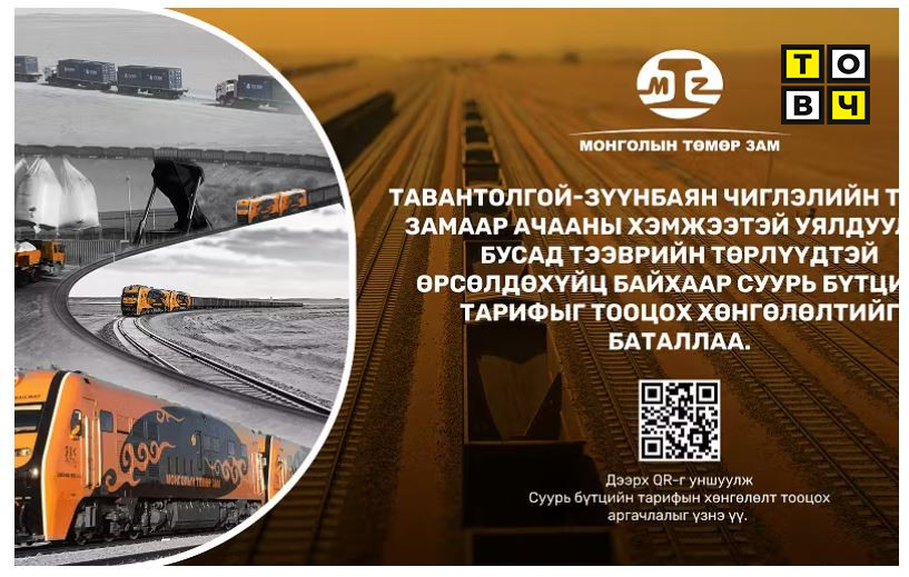 Зам, тээврийн хөгжлийн сайдын 2023 оны 12 дугаар сарын 21-ний өдрийн А/333 тоот тушаал, Монгол Улсын 2024 оны төсвийн тухай хуульд заасан экспортын нүүрсний тээвэрлэлтийн тодорхой хэсгийг төмөр замаар тээвэрлэхтэй холбогдуулан тээвэрлэгч байгууллагат олгох тарифыг уян хатан болгож, зах зээлийн эрэлт хэрэгцээнд тулгуурлан бусад тээврийн төрлүүдтэй өрсөлдөхүйц хөнгөлөлт үзүүлэн, зардлыг бууруулах зохион байгуулалтын арга хэмжээг авч ажиллахыг чиглэл болгосны дагуу Тавантолгой-Зүүнбаян чиглэлийн төмөр замын суурь бүтцийн тарифт тооцох хөнгөлөлтийг баталлаа.