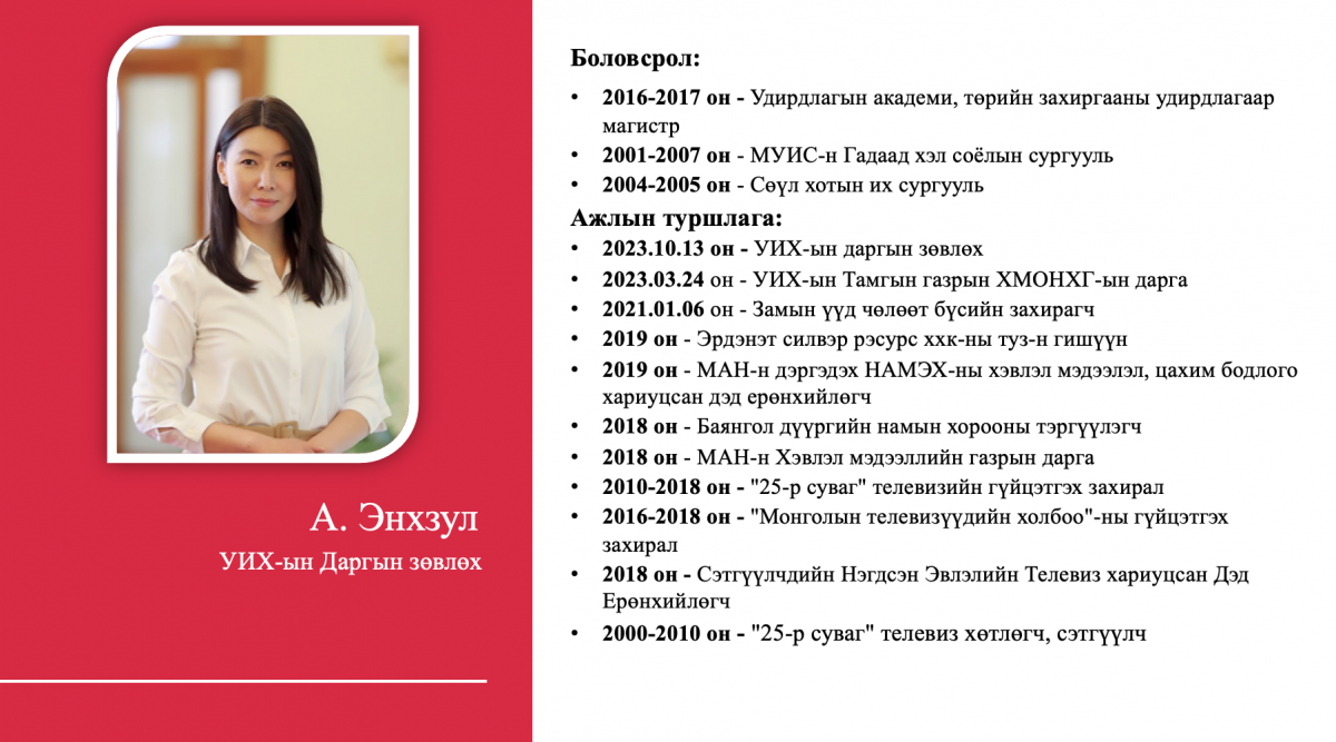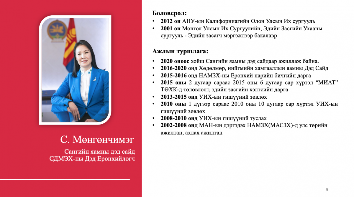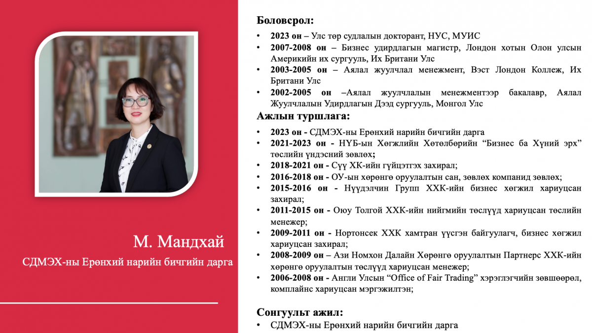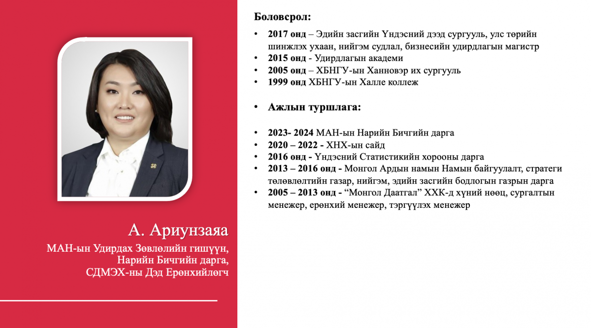 Тухайлбал, жагсаалтын 4-рт эрэмбэлэгдсэн О.Саранчулуун нь Италийн Трентогийн Их сургууль, АНУ-ын Колумбиагийн Их сургууль, Израйль улсын их сургууль зэрэгт магистр, докторант хамгаалсан бол жагсаалтын 8-рт эрэмбэлэгдсэн М.Мандхай нь Их Британи улсад бизнес, аялал жуучлалын чиглэлээр төгссөн, НҮБ болон Оюутолгой зэрэг дэлхийн томоохон компаниудад ажиллаж байжээ. Түүнчлэн 12-рт бичигдсэн А.Ариунзаяа нь ХБНГУ-ын Ханноверийн их сургуулийг төгссөн бол 14-рт бичигдсэн Б.Хэрлэн нь ХБНГУ-ын Постламын Их сургуулийн улс төрийн шинжлэх ухааны доктор, Удирдлагын академи, Хүний нөөцийн удирдлагын тэнхимийн дэд профессор аж.