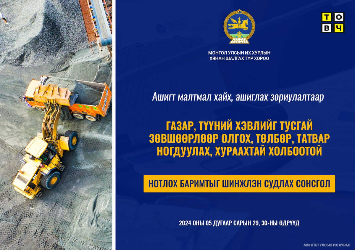 Улсын Их Хурлын 2024 оны 04 дүгээр сарын 12-ны өдрийн 25 дугаар тогтоолоор байгуулагдсан “Ашигт малтмал хайх, ашиглах зориулалтаар газар, түүний хэвлийг тусгай зөвшөөрлөөр олгох, төлбөр, татвар ногдуулах, хураахтай холбоотой үйл ажиллагаанд хяналт шалгалт хийх” үүрэг бүхий Хянан шалгах түр хорооноос зохион байгуулж буй нотлох баримтыг шинжлэн судлах нээлттэй сонсгол маргааш (2024.05.29) эхэлнэ.