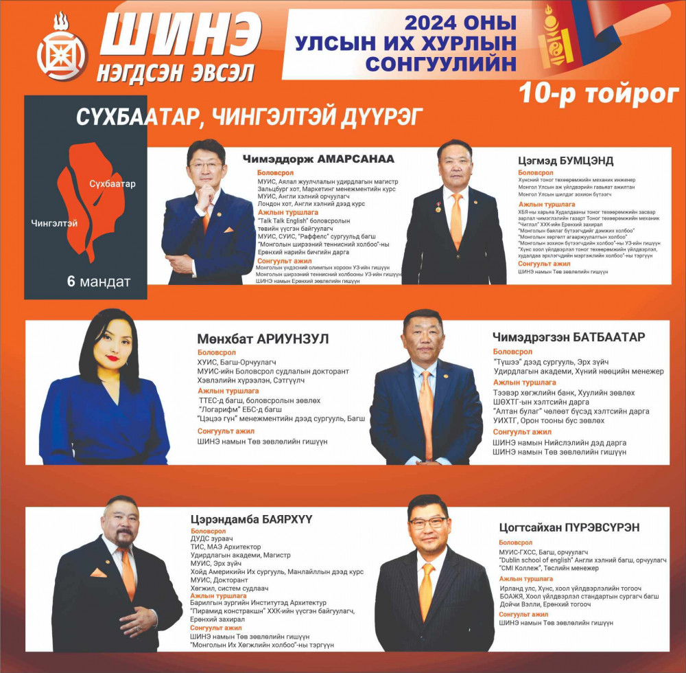 “ШИНЭ НЭГДСЭН ЭВСЭЛ”-ээс тойрогт нэр дэвшигчдийг танилцуулж байна. Тус эвслийн нийт нэр дэвшигчдийг мэргэжлээр нь авч үзвэл хуульч, эрхзүйч 20, инженер 20, багш 17, эдийн засагч 12, эмч 7 байна. Мөн малчдын төлөөлөл ч багтжээ. Түүнчлэн 12 доктор, профессор, Монгол Улсын Хөдөлмөрийн баатар 1, Монгол Улсын гавьяат цолтон 6 байх агаад нийт горилогчдын 60 гаруй хувь нь хос мэргэжил эзэмшжээ.