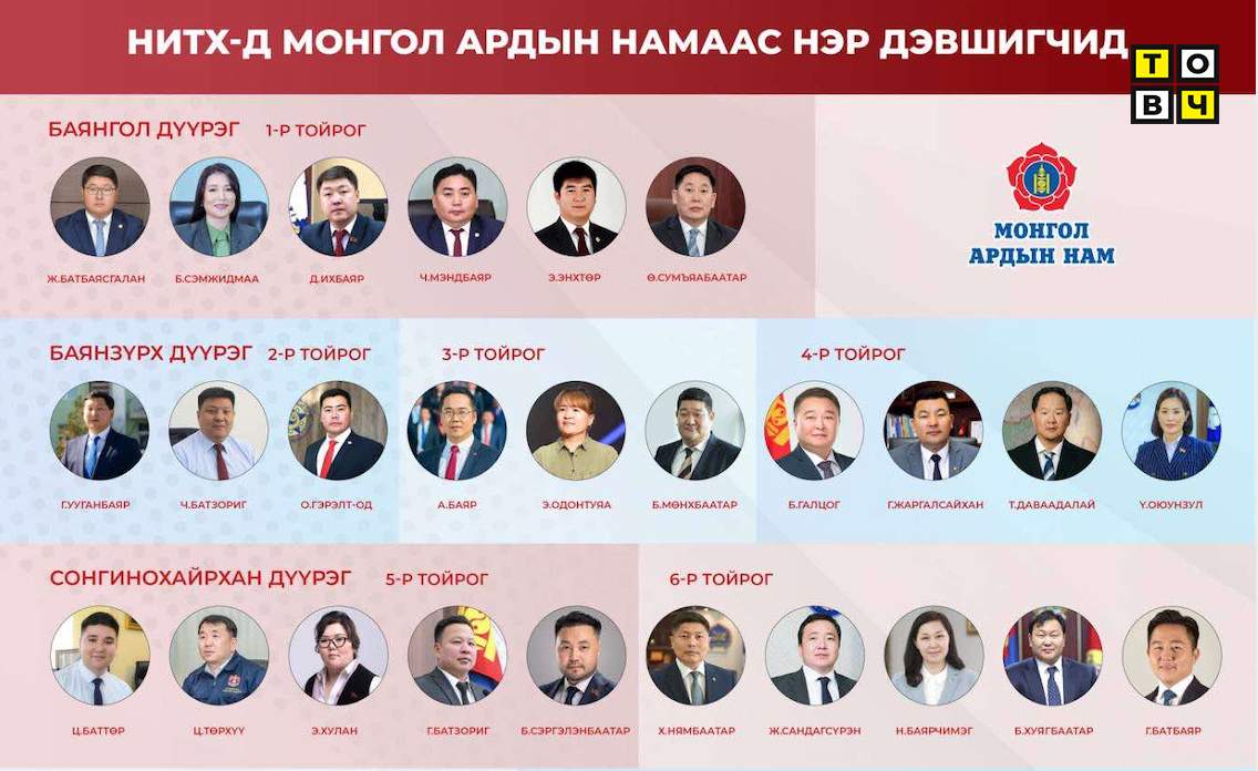 Энэ үеэр нийслэлийн МАН-ын хорооны дарга, Нийслэлийн Засаг дарга бөгөөд Улаанбаатар хотын захирагч Х.Нямбаатар “Бид НИТХ-д нэр дэвшигчдийг тодруулахын тулд өнгөрсөн наймдугаар сард хэд хэдэн нийгмийн судалгаа явуулсан. Нийслэлчүүд ирэх дөрвөн жил их бүтээн байгуулалт хийх цаг хугацаа учраас инженер, эдийн засагч, хуульчид илүүтэй түлхүү төлөөлбөл зүйтэй юм гэдэг хариулт өгсөн судалгааны дүн гарсан. Ингээд энэ судалгааны дүнг үндэслэж бид нэр дэвшигчдээ тодрууллаа. Манай нэр дэвшигчид дотор Монгол Улсад хэрэгжүүлсэн томоохон төслүүдийн менежментийн багийг ахалж ажилласан зөвлөх инженерүүд, Монгол Улсын барилгын залуу зөвлөх инженерүүд бий. Мөн хот төлөвлөгч, олон улсын банк санхүүгийн зах зээл дээр ажиллаж байсан санхүүчид, эдийн засагчид, Монголын хуулийн салбарын шилдэг төлөөллүүд багтсан. Түүнчлэн өмнө нь нийслэл, дүүргийн ИТХ-д нэр дэвшиж ялалт байгуулж байсан нийслэл, дүүргийн ИТХ-ын төлөөлөгчдийн төлөөллүүд бас бүрдсэн. Энд нэг зүйлийг дурдахад, бид өнгөрсөн зун болж өнгөрсөн УИХ-ын сонгуульд нэр дэвшээд ялалт байгуулж чадаагүй хүмүүсийг дэвшүүлэхгүй гэдэг зарчим барьсан” гэсэн юм.