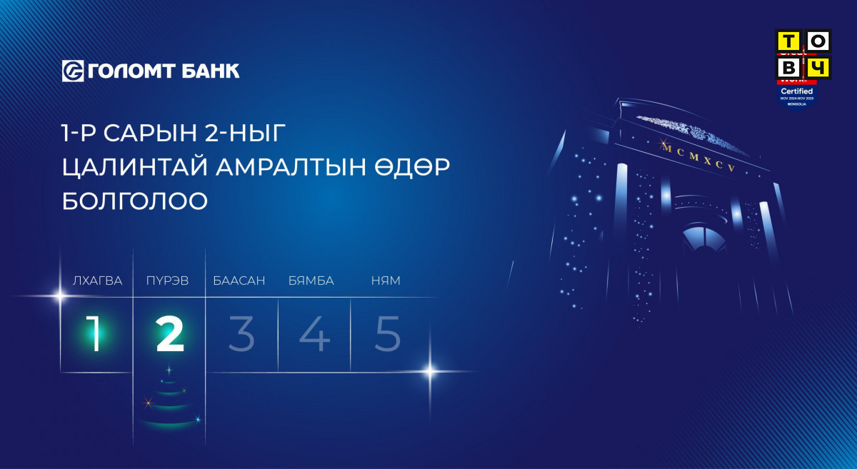 Эх орныхоо хөгжлийн голомт байх эрхэм зорилго дор нэгдэн хамтдаа үнэ цэн бүтээж буй 2,800 гаруй ажилтандаа зориулан Голомт банк шинэ оноо хайртай, дотны хүмүүстэйгээ өнгөрүүлэх боломжийг бүрдүүлж, 1-р сарын 2-нд цалинтай амралт олгохоор боллоо.