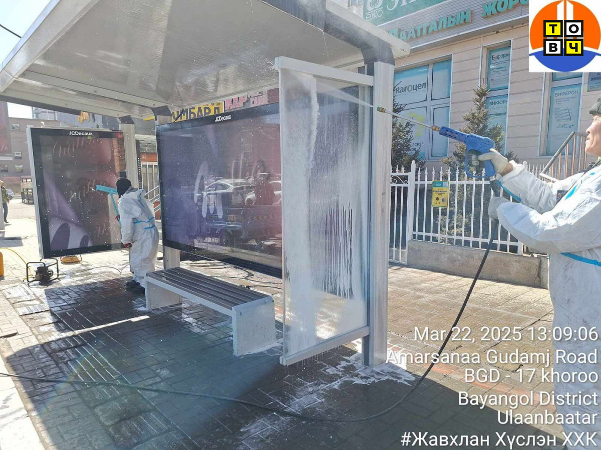 Мөн нийслэлийн хэмжээнд үйл ажиллагаа явуулж буй хог хаягдал, зам талбайн цэвэрлэгээ үйлчилгээний 40 байгууллага бүрэн бүрэлдэхүүнээрээ ажиллаж, хөшөө дурсгал, хайс хашлага, хогийн сав, сандал, нийтийн тээврийн автобусны зогсоолуудыг угааж, цэвэрлэв. Хог тээврийн байгууллагууд 2.1 сая мкв талбайгаас 800 тонн хог хаягдлыг цэвэрлэж, төвлөрсөн хогийн цэгт хүргэлээ.