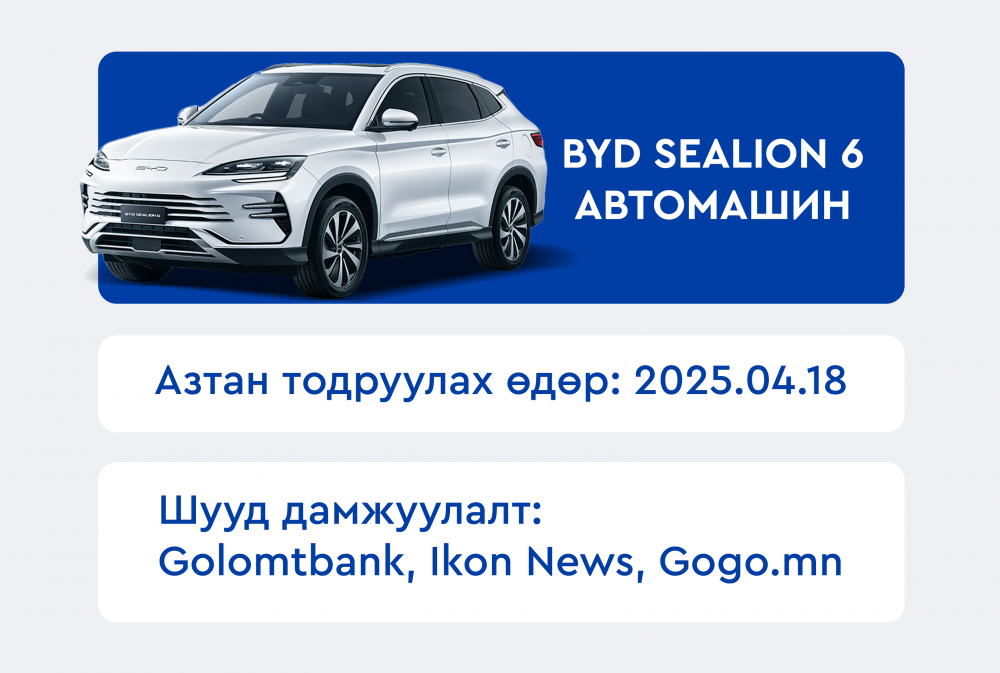 Харин сугалаат урамшууллын супер шагнал болох BYD-SEALION 6 автомашины азтаныг ирэх 4-р сарын 18-ны өдөр Golomt Bank фэйсбүүк хуудсаар шууд дамжуулан тодруулах гэж байна. Хөтөлбөрийн супер азтан BYD брэндийн Монгол дахь албан ёсны дистрибьютер MSM Групп ХХК-ийн оруулж ирдэг SEALION 6 бензин болон цахилгаан хөдөлгүүр хосолсон автомашины эзэн болох юм.