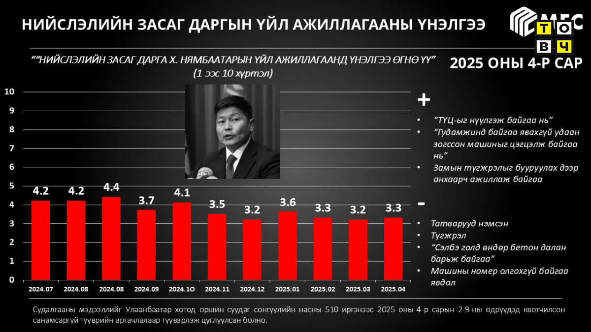 2025 оны 4-р сарын байдлаар Нийслэлийн Засаг дарга Х.Нямбаатарын үйл ажиллагаанд иргэдийн өгсөн үнэлгээ дунджаар 3.3 байгааг MEC судалгааны байгууллагаас мэдээллээ. Судалгаа нь Улаанбаатар хотын сонгуулийн насны 510 иргэнээс санамсаргүй түүврийн аргаар авсан бөгөөд сүүлийн 10 сарын дотор иргэдийн үнэлгээ тогтмол буурч буйг харуулж байна.
