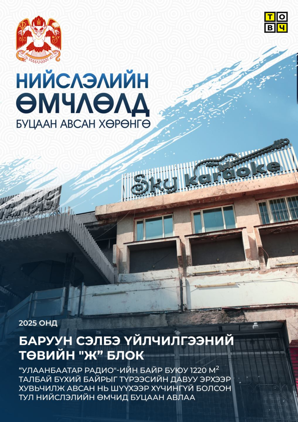 Нийслэлийн алдагдсан өмч хөрөнгийг эргүүлэн авах ажлыг хуулийн хүрээнд үе шаттай зохион байгуулж байна. Энэ хүрээнд Чингэлтэй дүүргийн 5 дугаар хороо, “Баруун Сэлбэ” үйлчилгээний төвийн (хуучнаар Нарны Титэм) барилгын “Ж” блокын зүүн жигүүрт байрлах "Улаанбаатар Радио" ХХК-д хамаарах нийт 1222 ам метр талбайг нийслэлийн өмчид буцаан авав.
