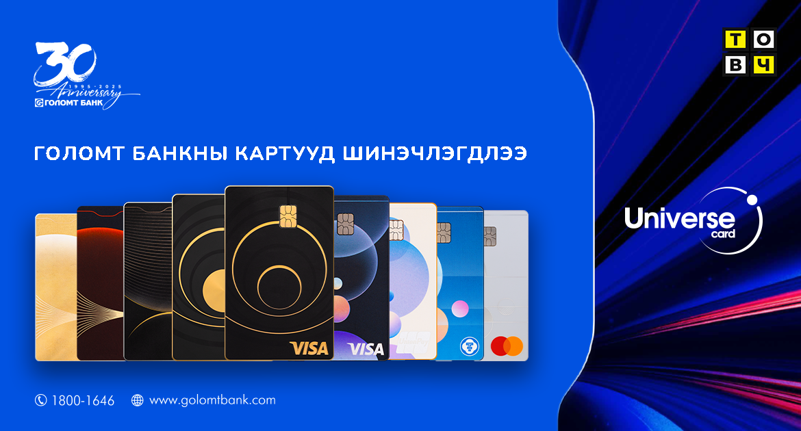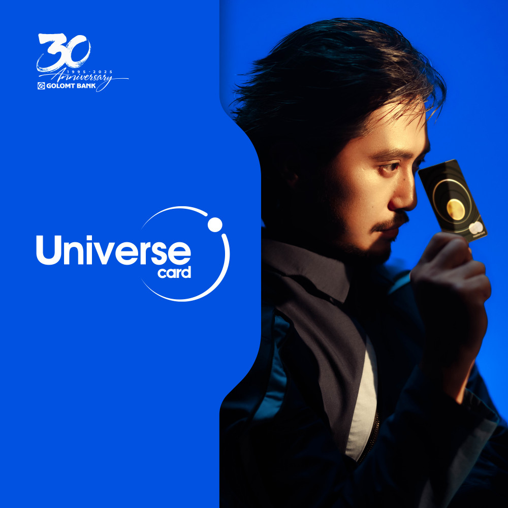 Голомт банкны хамт олон 30 жилийнхээ ойг тохиолдуулан картын загвараа бүрэн шинэчилж, хил хязгааргүй орон зай, цаг хугацааг илэрхийлэх Universe шинэ картуудаа танилцуулж байна. Universe загварын картууд нь санхүүгийн ертөнцийг таны гарт атгуулж, огторгуйн өргөн уудамд эргэлдэгч дагуул адил дэлхийн хаана ч таны санхүүгийн аяллын хөтөч болж, хил хязгааргүй боломж, дахин давтагдашгүй үнэ цэн, нэр хүндийн баталгааг өгөх болно.