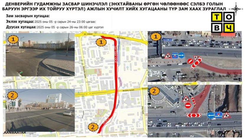 Сүхбаатар дүүргийн 7, 8 дугаар хороо, Денверийн гудамжны авто зам, Энхтайваны өргөн чөлөөнөөс Сэлбэ голын баруун эрэг дагуу Их тойруу хүртэлх 1.4 км авто замыг хааж, шинэчилнэ. Тодруулбал, тавдугаар сарын 24-ний 23:00 цагаас 26-ны 06:00 цагийн хооронд хааж, засварлана.