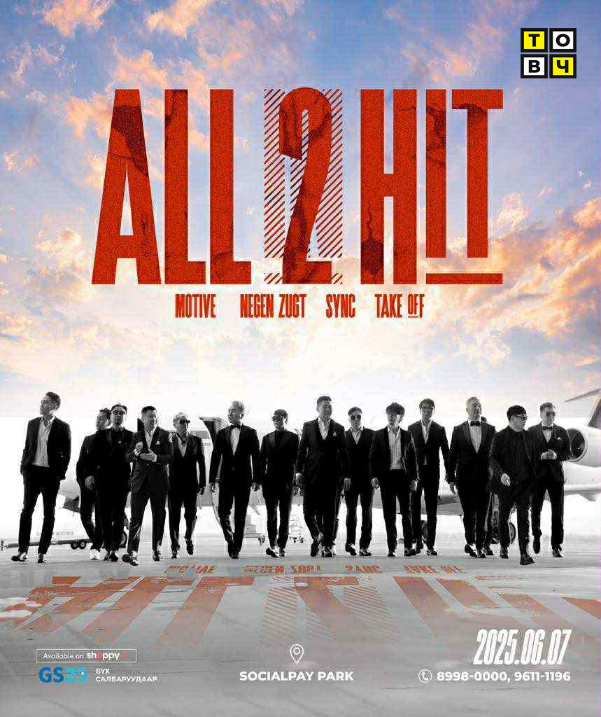 Монголын хайрын дууны хамтлаг, “Цасан бороо”, “Чи минь ганцхан”, “Чамдаа” зэрэг олон олон дуугаараа залуусыг байлдан дагуулж явсан Мотив хамтлаг, Анхны борооноор санаандгүй норж бидэнтэй танилцахдаа Монголын залуусыг нэгэн цагт, нэгэн зүгт хөтөлсөн “Нэгэн зүгт” хамтлаг, Цасан дээр нэрийг чинь бичлээ хэмээн дуулж, дуунд хайртай үзэгчдийнхээ зүрх сэтгэлд нэрээ үлдээсэн Take off хамтлаг, "Миний гэр- II" реалити шоуны цуврал болох "Чи шүү" шоунаас уран бүтээлийнхээ гарааг эхэлсэн, дуу бүр нь дурсамж агуулах "Sync" хамтлаг хамтран 6 дугаар сарын 7-нд “ALL IN HIT 2” тоглолтоо хийж, SocialPay park-г бут ниргэх гэж байна.