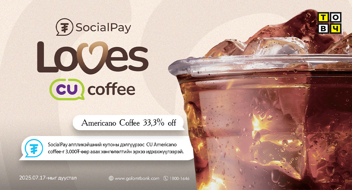 Хөнгөлөлт, урамшууллаар хэрэглэгчдэдээ үргэлж бэлэг барьдаг SocailPay аппликэйшн ээлжит урамшууллаа СU сүлжээ дэлгүүртэй хамтран хэрэгжүүлж байна. “SocialPay loves coffee” аяны хүрээнд SocialPay болон SocialPay Junior-ийн хэрэглэгчид 2025.06.18-2025.07.17-ны хооронд CU сүлжээ дэлгүүрийн бүх салбараас АМЕРИКАНО-г ердөө 3,000₮-өөр худалдан авах боломжтой.