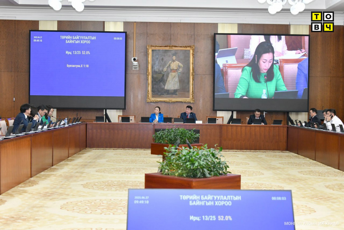Монгол Улсын Их Хурлын Төрийн байгуулалтын байнгын хороо өнөөдөр /2025.06.27/ хуралдаж Монгол Улсын Их Хурлын 2025 оны хаврын ээлжит чуулганаар хэлэлцэх асуудлын жагсаалтад ороогүй хууль, тогтоолын төслүүдийг чуулганаар хэлэлцүүлэх эсэх асуудлыг хэлэлцэв.
