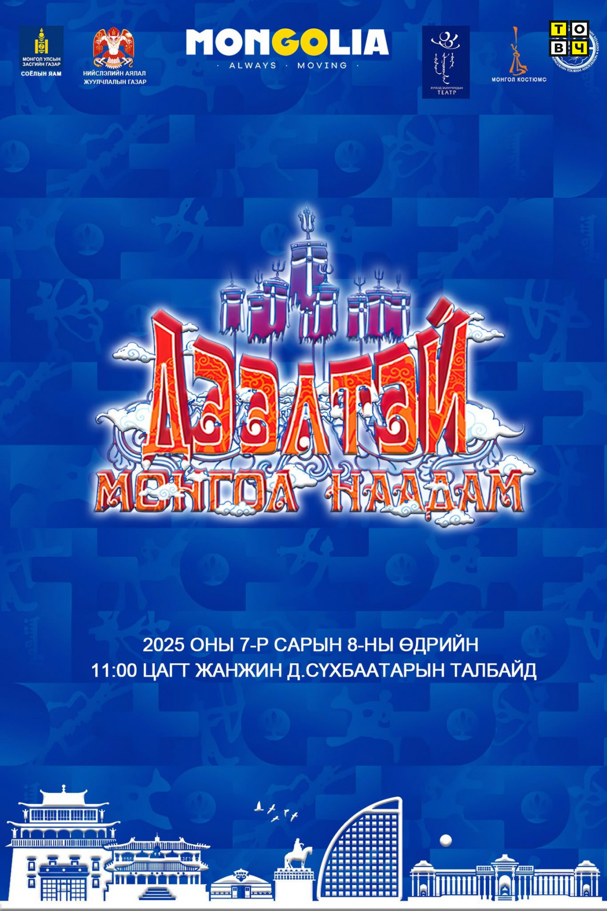 Нийслэлийн Засаг даргын тамгын газар, нийслэлийн Аялал жуулчлалын газар, Соёл, Спорт, Аялал жуулчлал, Залуучуудын яам, Улсын хүүхэд залуучуудын театр, Монголын Аялал жуулчлалын холбоо болон “Монгол костюмс” төв хамтран “Дээлтэй Монгол наадам”-ыг 19 дэх удаагаа зохион байгуулах гэж байна. Тус наадам энэ сарын 8-ны өдрийн 11 цагт Д.Сүхбаатарын талбайд болно.