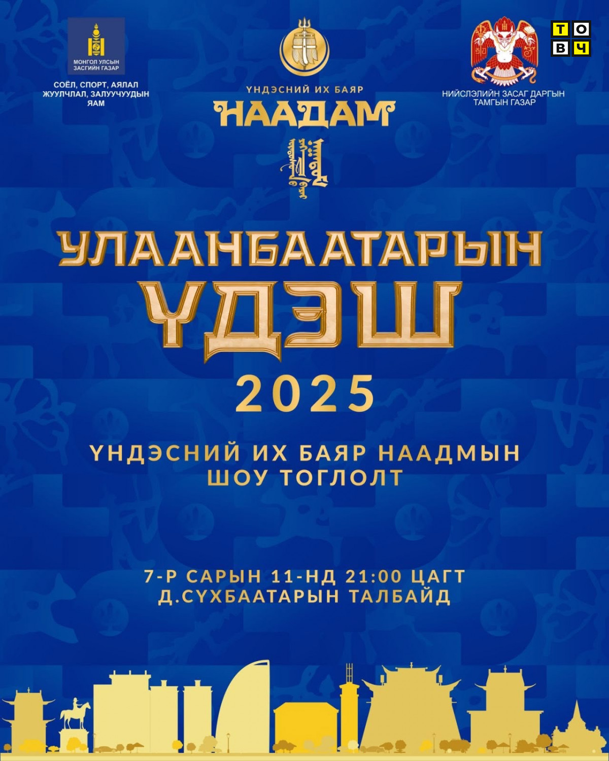 Тулгар төрийн 2234, Их Монгол Улсын 819, Үндэсний эрх чөлөө, тусгаар тогтнолоо сэргээн мандуулсны 114, Ардын хувьсгалын 104 жилийн ойд зориулсан “Улаанбаатарын үдэш 2025” Үндэсний их баяр наадмын шоу тоглолтыг Д.Сүхбаатарын талбайд уламжлалт ёсоор зохион байгуулна.