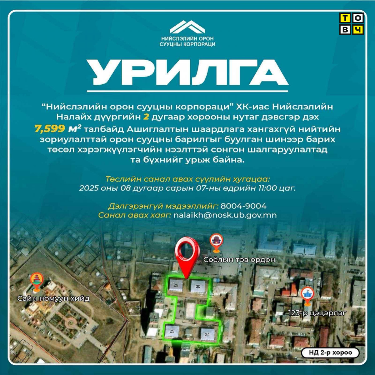 - Төслийн байршил: Налайх дүүргийн 2 дугаар хорооны нутаг дэвсгэрт 7,599 м.кв талбайд орон сууцны барилгын төсөл хэрэгжүүлэгчээр оролцох санал гаргагчдын материалыг төсөл хэрэгжүүлэгчийг сонгон шалгаруулах, үнэлэх баримт бичигт заасны дагуу хүлээн авна.