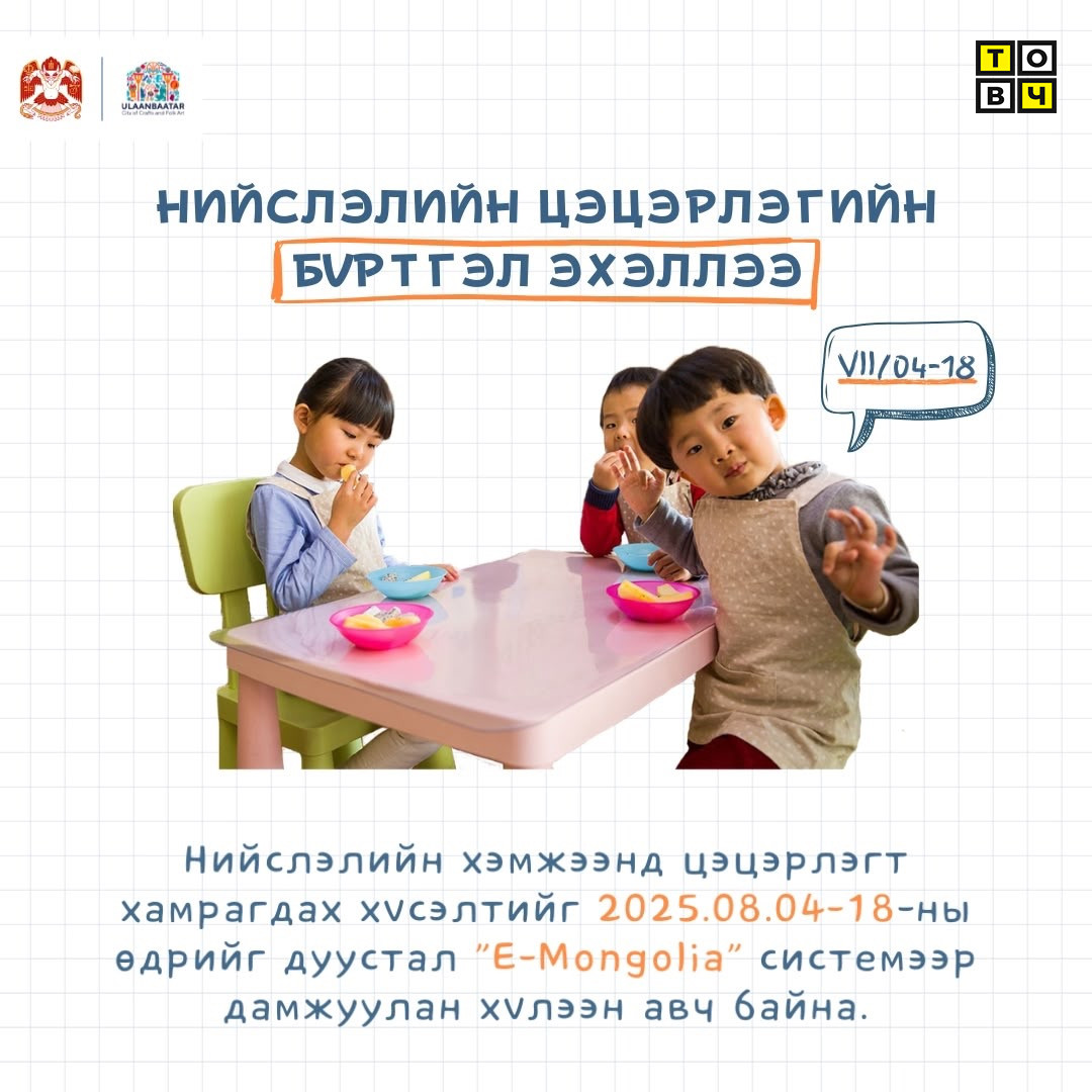 Нийслэлийн хэмжээнд сургуулийн өмнөх боловсрол буюу цэцэрлэгийн бүртгэл өнөөдрөөс эхэллээ. Цэцэрлэгийн бүртгэлийн хүсэлтийг наймдугаар сарын 4-18-ны өдрийг дуустал “E-Mongolia” системээр дамжуулан хүлээн авна. Тун удахгүй эхлэх хичээлийн шинэ жилд улсын хэмжээнд 278’290 хүүхэд сургуулийн өмнөх боловсролд хамрагдах төлөв гарсан. Тэднээс 135’582 нь нийслэлд хамрагдах юм.