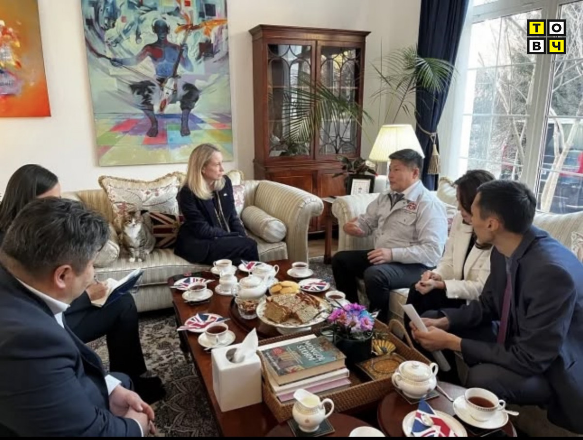 Их Британи Улсаас Монгол Улсад суугаа Элчин сайд Фиона Блайт, муур Мискийгийн хамт, Нийслэлийн Засаг дарга Хишгээгийн Нямбаатартай хамт хуралдаж буй нь (Зураг: FCDO)