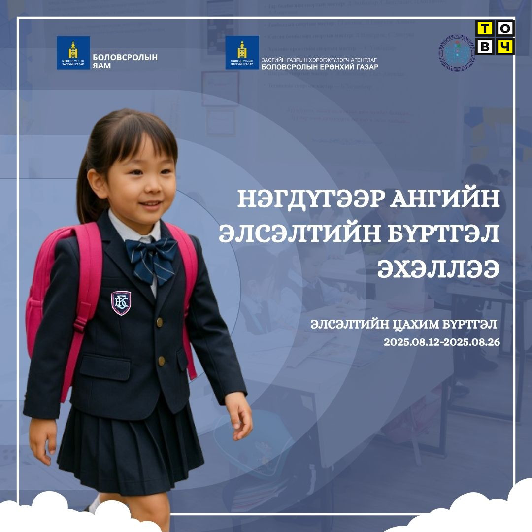 2025-2026 оны хичээлийн жилд Төрийн өмчийн ерөнхий боловсролын сургуулийн 1 дүгээр ангийн элсэлтийн цахим бүртгэлийг улсын хэмжээнд 2025 оны 08 дугаар сарын 12-ны өдрөөс 08 дугаар сарын 26-ны өдрийг дуустал E-Mongolia системээр дамжуулан зохион байгуулна.