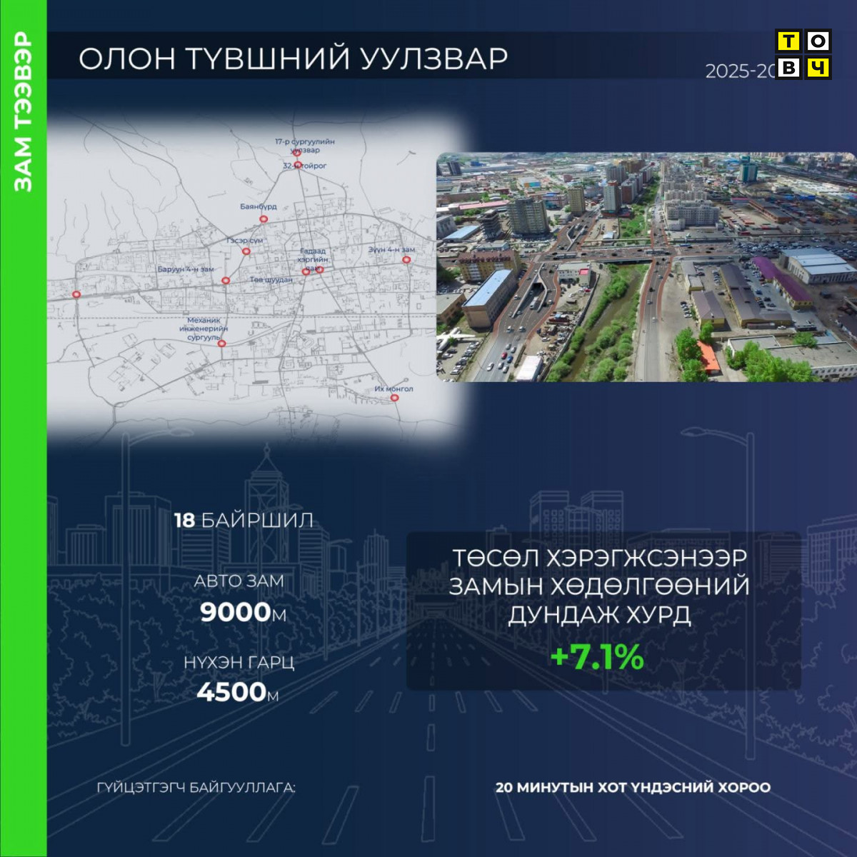 Улаанбаатар хотыг хөгжүүлэх 24 мега төслийн хүрээнд нийслэлийн 18 байршилд олон түвшний уулзвар барина. Тодруулбал, Баруун 4 зам, Саппоро, Механик инженерийн сургууль (МИС), Төв шуудан, Гэсэр сүм, Баянбүрд, 32-ын тойрог, 17-р сургуулийн уулзвар, Гадаад хэргийн яам, Зүүн 4 зам, Их Монгол зэрэг замын хөдөлгөөний ачаалал ихтэй байршилд нийт 9 км урт авто зам, 4.5 км урт нүхэн гарц болон гүүрэн байгууламж шинээр барих юм. Төсөл хэрэгжсэнээр замын хөдөлгөөний дундаж хурд 7.1 хувиар нэмэгдэнэ. 2025-2028 он хүртэл төслийг гүйцэтгэнэ.
