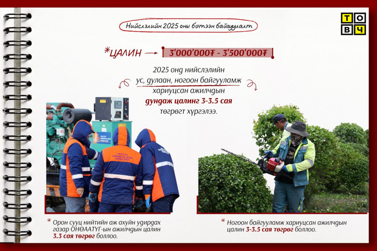 Нийслэлээс 2025 онд ногоон байгууламж хариуцсан ажилчдын цалинг 3-3.5 сая төгрөг, Орон сууц нийтийн аж ахуйн удирдах газар ОНӨААТҮГ-ын ажилчдын дундаж цалинг 3.3 сая төгрөг болгож нэмэгдүүллээ. Нийслэлийн есөн дүүрэгт нийт 157 га талбайд ногоон байгууламжийн арчилгааны 27 байгууллага 320 ажилтантай ажилладаг. Ногоон байгууламжийн арчилгаа хариуцсан ажилчид сард 1.7-1.9 сая төгрөгийн цалин авдаг байсныг нийслэлийн Засаг даргаас өгсөн үүрэг чиглэлийн дагуу нэмэгдүүлж, 3.5 сая төгрөгт хүргэсэн. Мөн ногоон байгууламжийн 1 га талбайн арчилгааны үнэлгээ 100 орчим сая төгрөг байсныг 150 сая төгрөг болгож нэмэгдүүлсэн юм.