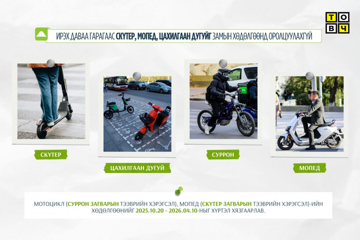 Нийслэлийн Засаг даргын А/1453 тоот захирамжаар нийслэлийн нутаг дэвсгэрт скүтер, мопед, цахилгаан дугуйг ирэх даваа гарагаас эхлэн замын хөдөлгөөнд оролцуулахгүй. Тодруулбал, замын хөдөлгөөнд оролцогчдын аюулгүй байдлыг хангаж, зам тээврийн ослоос урьдчилан сэргийлэх зорилгоор дээрх тээврийн хэрэгслийг 2025 оны аравдугаар сарын 20-ны өдрөөс 2026 оны дөрөвдүгээр сарын 10-ны өдрийг хүртэлх хугацаанд замын хөдөлгөөнд оролцуулахгүй юм.