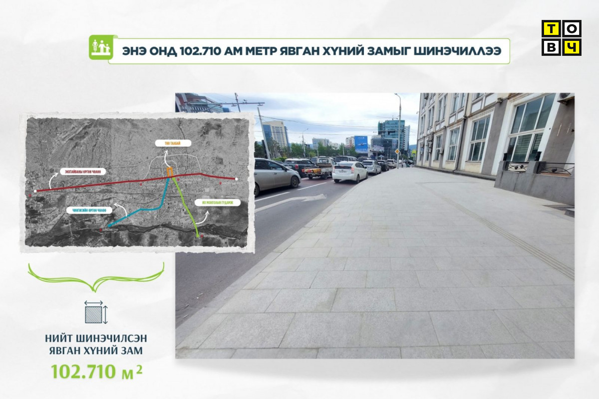 2025 онд олон жил шинэчлээгүй нийслэлийн гол гудамж замын явган хүний замыг байгалийн чулуун хавтангаар шинэчилж эхэлсэн. Тодруулбал, энэ онд нийт 15 байршилд 186.701 ам метр талбайг байгалийн чулуун хавтангаар хучихаар төлөвлөсөн. Өнөөдрийн байдлаар 102.710 ам метр талбайг байгалийн чулуун хавтангаар шинэчилж, явган хүний замын ажлыг гүйцэтгээд байна. Явган замын засвар, шинэчлэлийн ажлыг эрчимжүүлэх хүрээнд 37 албан хаагч өдөр бүр хуваарийн дагуу гүйцэтгэгч компанийн ажлын явцад хяналт тавин ажилласан. Мөн явган хүний замын хуучин хавтганаар гэр хорооллын нарийн гудам, гудамж талбайг тохижуулж байна. Тухайлбал, СХД-ийн 8, 15, 18, 20, 25, 27, 43 дугаар хорооны нарийн гудамжны явган замын нийт 1500 ам метр талбайг хуучин хавтангаар тохижуулсан.