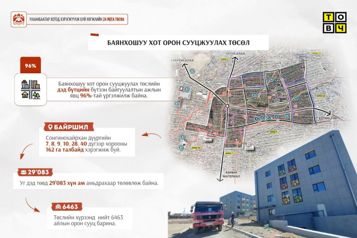 Улаанбаатар хотын хөгжлийн 24 мега төслийн нэг Баянхошуу хот орон сууцжуулах төсөл буюу Баянхошуу дэд төвийн хүрээнд Сонгинохайрхан дүүргийн 7, 8, 9, 10, 28, 40 дүгээр хорооны 162 га талбайд хэрэгжиж буй. Уг дэд төвд 30 мянга орчим хүн ам амьдрахаар төлөвлөж байгаа бөгөөд нийт 6463 айлын орон сууц барих юм. Өнөөдрийн байдлаар Баянхошуу дэд төвийн дэд бүтцийн бүтээн байгуулалт 96 хувьтай үргэлжилж байна. Тус дэд төвд 20 айлын үйлчилгээтэй орон сууц, 240 хүүхдийн ортой цэцэрлэг, бизнес инкубатор төв, 50 айлын орон сууц, 35/10кВ дэд станц зэргийг ашиглалтад оруулаад байна. Үерийн хамгаалалтын далан, тохижилтын ажлууд дууссан. Мөн 2.4 га газарт цэцэрлэгт хүрээлэн байгуулж байгаа бөгөөд 91 хувьтай байна.