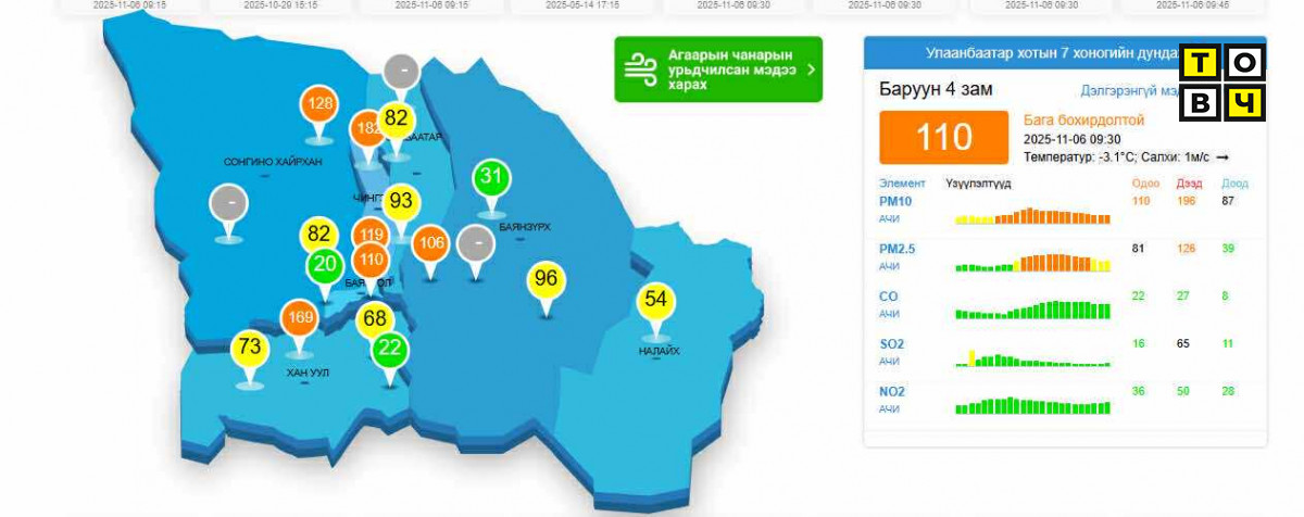 2025 оны 11 дүгээр сарын 06-ны өдрийн 08:00 цагийн агаарын чанарын индекс
