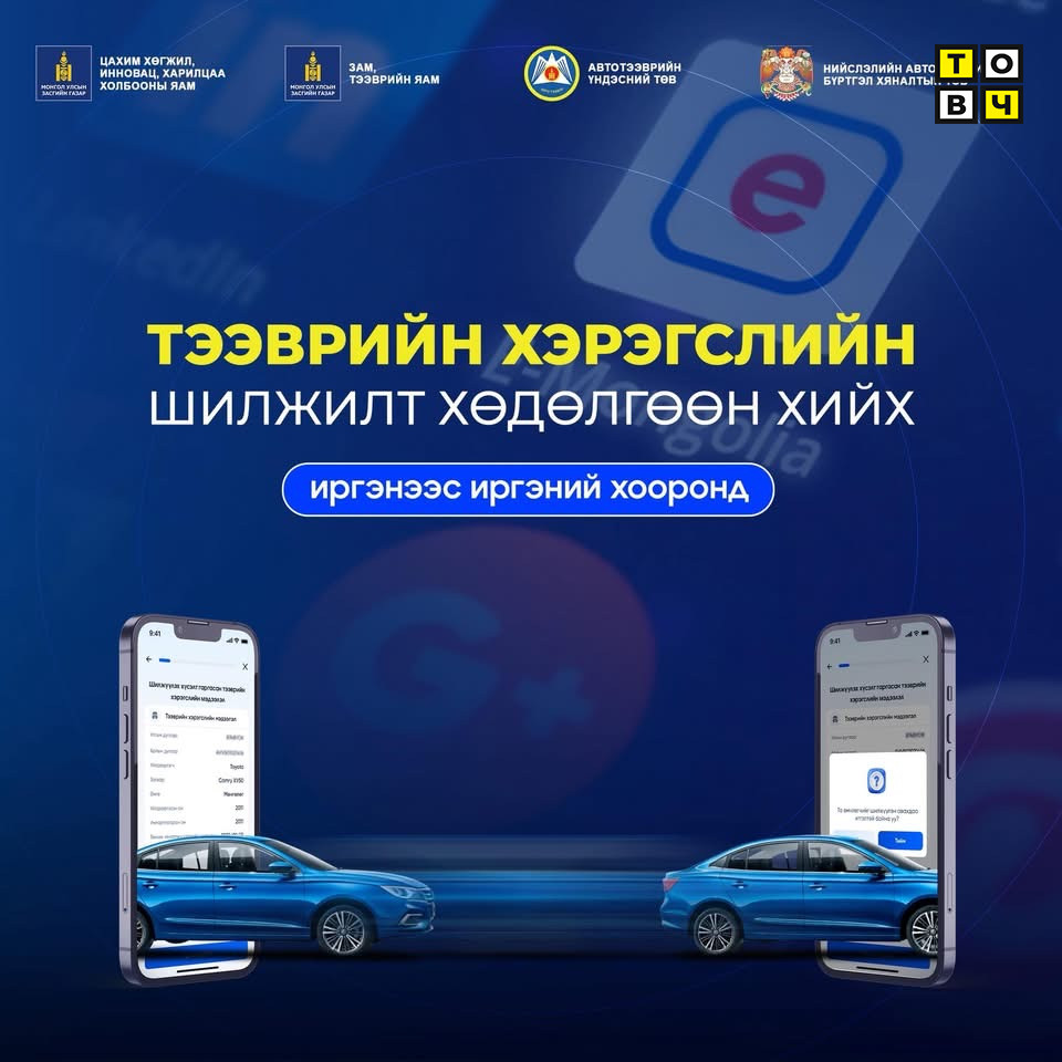Тээврийн хэрэгслийн шилжилт хөдөлгөөнийг илүү шуурхай, ил тод, хүртээмжтэй болгох үүднээс ЦХИХХ-ны яам, Зам, тээврийн яам, “И-Монгол академи” УТҮГ, Нийслэлийн автотээврийн бүртгэл хяналтын төв, Автотээврийн үндэсний төв хамтран уг үйлчилгээг E-Mongolia системд бүрэн цахимжуулан нэвтрүүллээ.