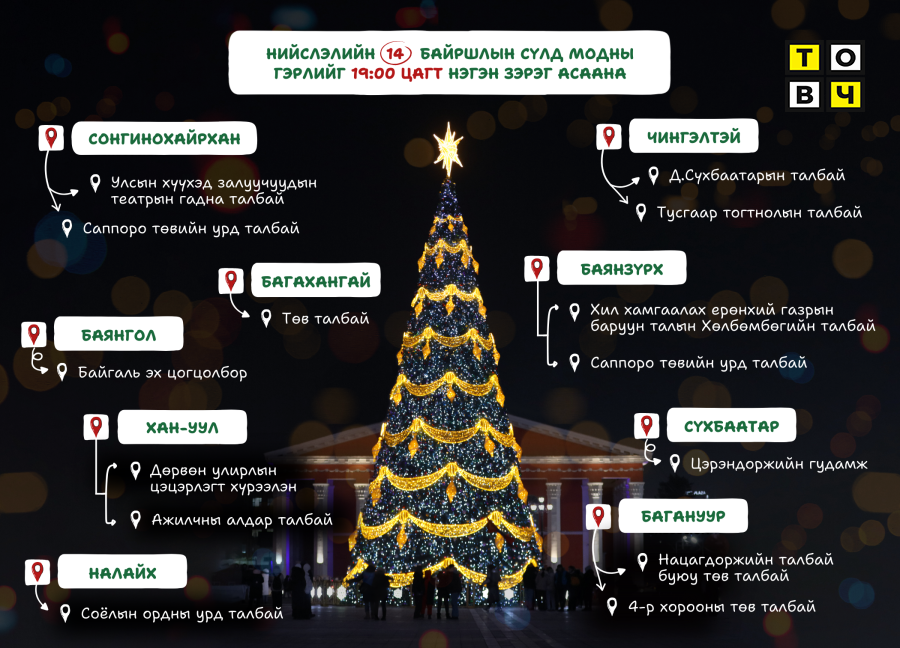 Шинэ жилийн баярыг угтан нийслэлийн есөн дүүргийн 14 байршилд сүлд мод засаж, нэгэн зэрэг гэрлийг 19:00 цагт өнөөдөр асаахаар болсон талаар НЗДТГ-аас мэдээллээ.