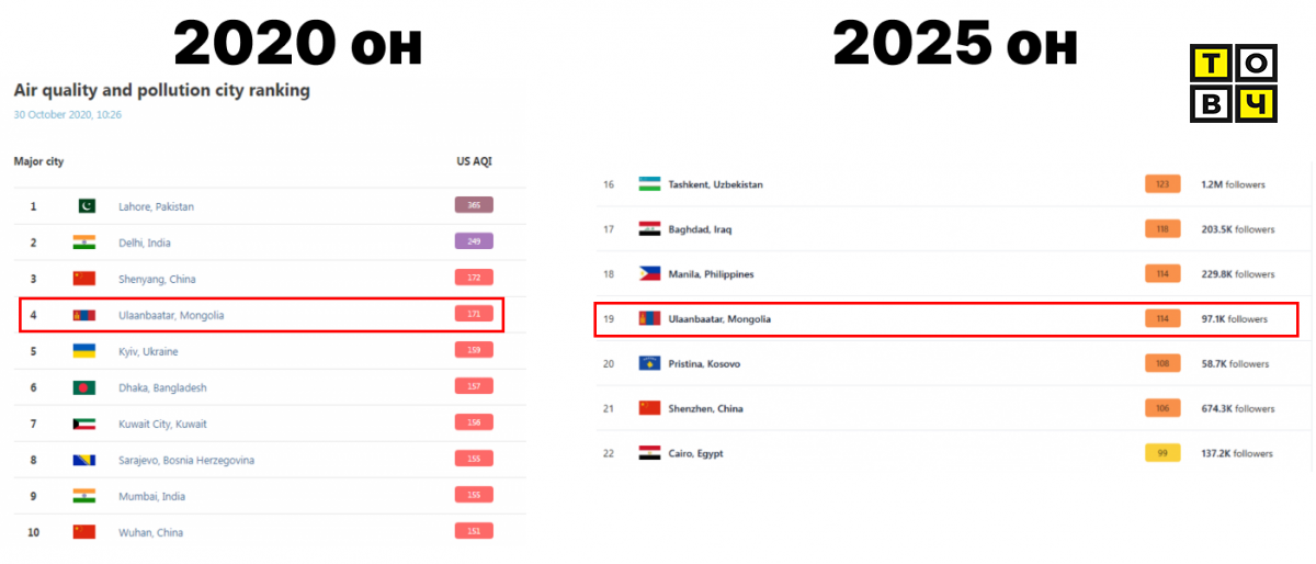 2023, 2024 оны 12 дугаар сарын байдлаар Улаанбаатар хотын Баянхошуу, Хайлааст, 5 буудал, Нэгдүгээр хороолол, Зурагт орчимд агаарын чанарын индекс 426-500 буюу маш их бохирдолтой. Бусад байршилд агаарын чанарын индекс дунджаар 200 байсан. 2025 оны байдлаар Улаанбаатар хотын агаарын чанарын индекс 115 болж, агаарын чанар 2-5 дахин сайжирсан байна. Өөрөөр хэлбэл, Улаанбаатар хот агаарын бохирдлоор эхний тавд бичигддэг байсан бол энэ жил 19-д жагсаж байна.