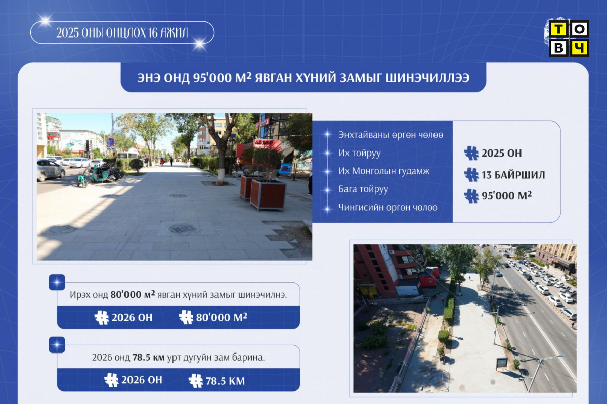 Энэ онд Улаанбаатар хотын гол гудамж, замууд болох Энхтайваны өргөн чөлөө, Их тойруу, Бага тойруу, Их Монголын гудамж болон Чингисийн өргөн чөлөө дагуух 13 байршилд 95 мянган ам.метр явган хүний замыг шинэчиллээ. Явган хүний замыг барзгар гадаргуутай байгалийн чулуун хавтангаар шинэчилж буй онцлогтой. 2026 онд үргэлжлүүлэн 80 мянган ам.метр явган хүний замыг шинэчилнэ.