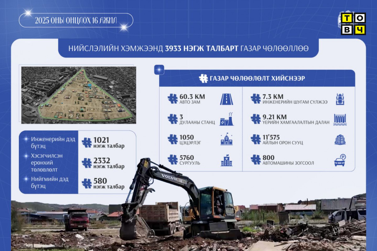 Энэ онд нийслэлийн хэмжээнд нийт 3933 нэгж талбарт газар чөлөөллөө. Тодруулбал, инженерийн дэд бүтцийн хүрээнд 1021 нэгж талбар, хэсэгчилсэн ерөнхий төлөвлөлтийн хүрээнд 2332 нэгж талбар, нийгмийн дэд бүтцийн ажлуудад 580 нэгж талбар чөлөөллөө. Нийслэлийн Засаг даргын захирамжаар иргэдийн эрүүл, аюулгүй амьдрах орчин нөхцөлийг бүрдүүлэх зорилгоор нийслэлийн нутаг дэвсгэрт газар чөлөөлөлт үргэлжилж байна. 2025 онд газар чөлөөлснөөр 11575 айлын орон сууц барих нөхцөл бүрдсэн. Түүнчлэн 60.3 км авто зам барихад 28 байршилд газар чөлөөллөө. Инженерийн шугам сүлжээ шинэчлэхэд 13 байршил, үерийн хамгаалалтын далан барихад таван байршил, цэцэрлэг, сургууль барихад 14 байршил, сургуулийн орчимд 800 автомашины зогсоол байгуулах, гурван дулааны станц барих, нийгмийн зайлшгүй хэрэгцээтэй бусад барилга байгууламж барихад 21 байршилд газар чөлөөлөөд байна.
