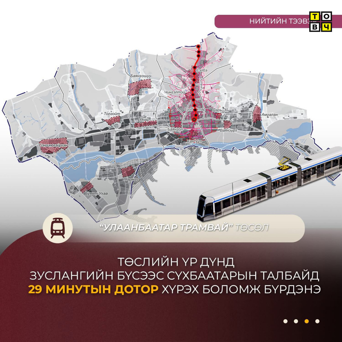 Нийслэлийн нийтийн тээврийн бүтцийг шинэ шатанд гаргахаар “Улаанбаатар трамвай” төслийг хэрэгжүүлэхээр төлөвлөсөн. “Улаанбаатар трамвай” төсөл нь хотын босоо тэнхлэгийн дагуу хоёр шугам, хос замтай хэрэгжинэ. Тодруулбал, нэгдүгээр шугам нь Зуслангийн бүсээс Сүхбаатарын талбай хүртэл 11 км урт, 16 зогсоолтой, хоёрдугаар шугам нь Архивын ерөнхий газраас Сүхбаатарын талбай хүртэл 15 км урт, 23 зогсоолтой байх юм. Энэхүү төсөл 2040 оны түвшинд замын хөдөлгөөнд зарцуулах хугацааны зардлыг хоёр чиглэлд нийлбэр дүнгээр өдөрт 99.22 сая ам.доллароор бууруулах эдийн засгийн үр ашигтай юм. Улаанбаатар трамвай төсөл хэрэгжсэнээр автобус богино эргэлтэд орж иргэдэд түргэн шуурхай үйлчлэх боломж бүрдэнэ. Мөн автомашины дундаж хурд нэмэгдэнэ. Трамвай таван минут тутамд эргэх бөгөөд Архивын ерөнхий газраас Сүхбаатарын талбай хүртэл нийт 37 минут явахаар төлөвлөгдсөн. Харин Зунжингаас Сүхбаатарын талбай хүртэл 29 минут явна.