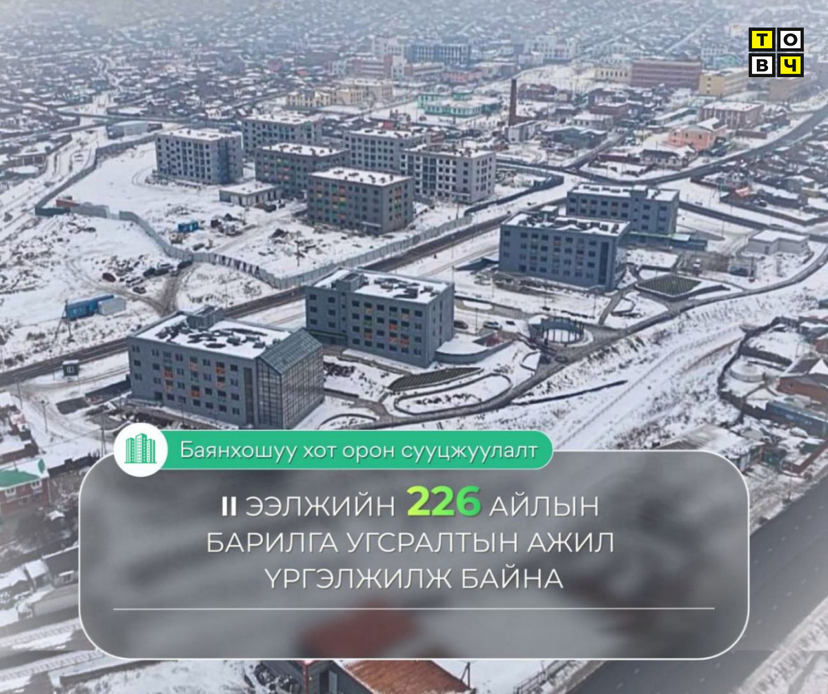Нийслэлийн гэр хорооллыг байгаль орчинд ээлтэй, ухаалаг дэд бүтэц бүхий суурьшлын бүс болгон өөрчлөх "Улаанбаатар хотын ногоон орон сууц" төслийн бүтээн байгуулалт Баянхошуу болон Шархад дэд төвд үргэлжилж байна. Азийн хөгжлийн банк (ADB) болон Уур амьсгалын ногоон сангийн (GCF) санхүүжилтээр хэрэгжиж буй тус төсөл нь нийслэлийн тулгамдсан асуудал болох түгжрэл, агаар, хөрсний бохирдлыг шийдвэрлэх цогцоор шийднэ. Төслийг хоёр үе шаттай хэрэгжүүлэх бөгөөд нийт 55 га талбайд 5000 айлын орон сууц барина. Төслийн нэгдүгээр үе шатанд Баянхошууны 5.5 га талбайд 462 айлын орон сууц барихаас эхний ээлжийн 4 блок 110 айлын орон сууцны барилгыг өнгөрсөн 9 дүгээр сард ашиглалтад оруулсан. II ээлжийн 226 айлын 6 блок барилгын ажил хэвийн үргэлжилж байна. Тодруулбал, B13-1 талбайн 150 айлын дөрвөн блок барилгын ажил 71-81 хувийн гүйцэтгэлтэй байгаа бол B13-2 талбайн 76 айлын хоёр блок 58 хувийн явцтай байна.