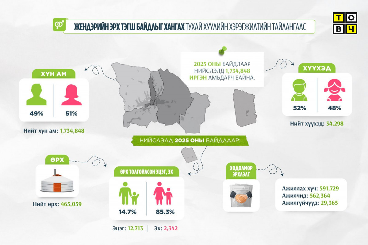 Нийслэлээс жендэрийн эрх тэгш байдлыг хангах бодлого, үйл ажиллагааг дэмжин ажилладаг. Энэ хүрээнд Жендерийн эрх тэгш байдлыг хангах тухай хуулийн хэрэгжилтийн тайланг гаргалаа. Тус тайланд тусгагдсан мэдээллээс хүргэе.