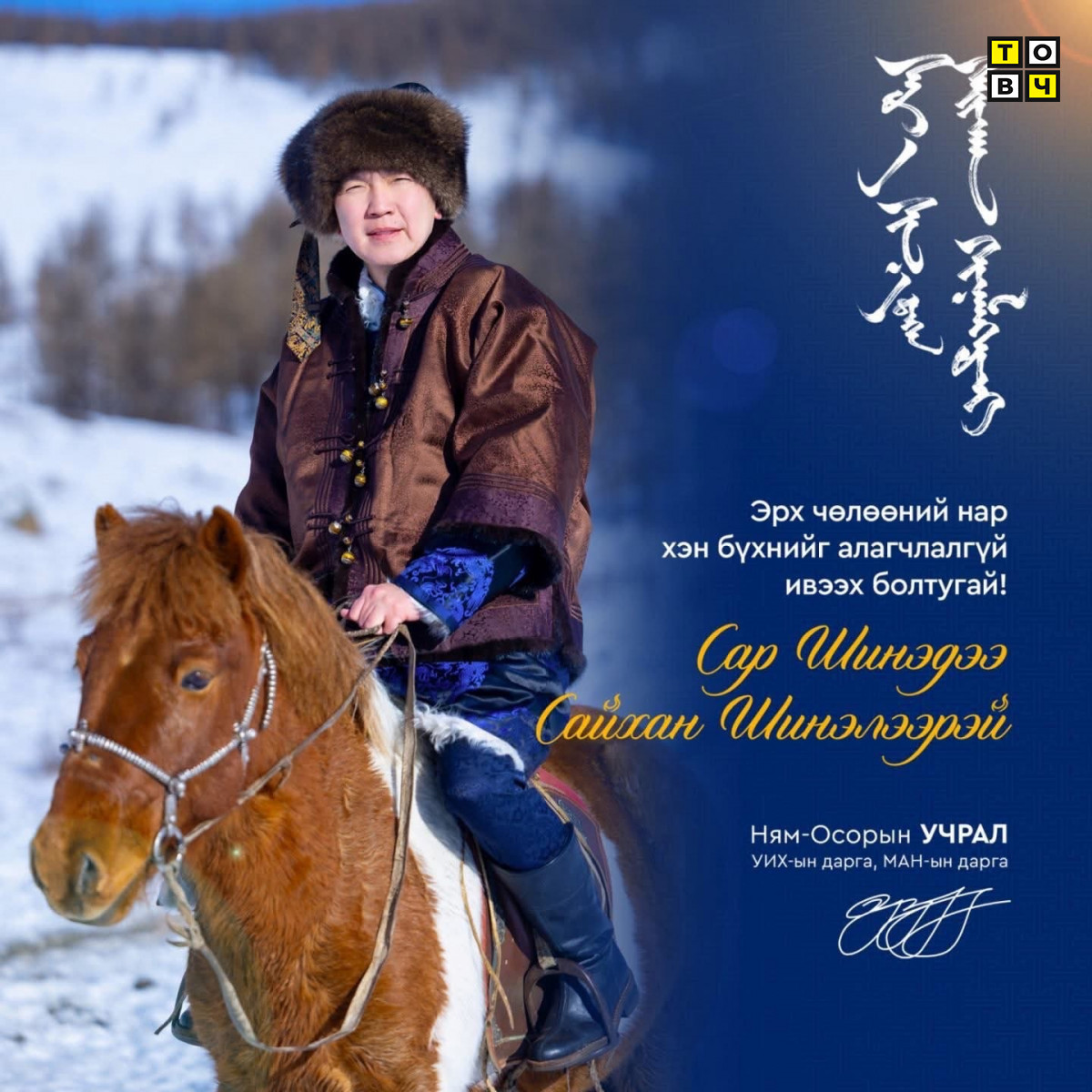 Их түүхийн эзэн, эрх чөлөөт, омог бардам монгол хүн Танд ирж буй “Сүрээр дарагч” хэмээх гал улаан морин жилдээ морьтой хийморьтой, заяа буянтай, эрүүл энх, эвтэй эетэй, үйлс бүхэн нь тэгш, юу санасан есөн хүсэл нь сэтгэлчлэн бүтэхийн ерөөлийг өргөе!