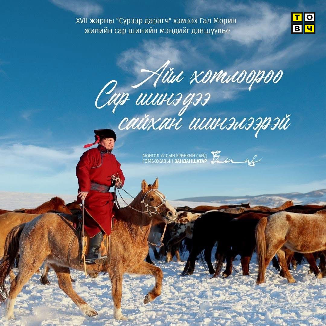Энэ гал морин жилд Их Эзэн Чингис хааны үүсгэн байгуулсан Их Монгол Улсын 820 жилийн ой тохионо. Эзэн Чингис хаан маань Их Монгол Улсаа үүсгэн байгуулаад 1206 онд цагаан сарыг Төрт ёсны их баяр болгон тэмдэглэх зарлиг буулгасан түүхтэй. Тэнгэрийн хүлэг морин сүлдтэй Монгол түмэн минь ирж буй гал морин жилдээ галын дөл мэт мандан бадарч, тэнгэрийн хүлэг мэт хийморь лундаатай, юу санасан есөн хүсэл бүхэн нь сэтгэчлэн бүтэж, эрүүл энх саруул сайхан, төрлөөрөө төвшин амгалан, элгээрээ энх амгалан байхын өлзийтэй ерөөлийг өргөн дэвшүүлье.