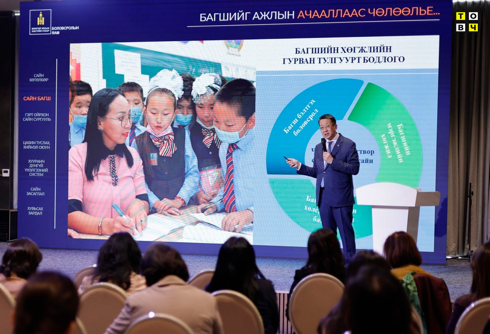 Харин менежмент сайжруулах нэрээр хамтран ажиллахдаа тухайн төрийн өмчийн сургуулийнхаа багш нарыг авсан тухай мэдээллийг зарим нэг орон нутгаас ирүүлснийг жишээ болгож хэлсэн бөгөөд ийм тохиолдолтой эвлэрэхгүй гэдгээ сайдын хувьд дахин хэлье. Багш хаана ажиллах, ямар цалин авах нь хувь хүний эрхийн асуудал бөгөөд багшийн дутагдлаас гарахад төр, хувийн хэвшил харилцан биесээ дэмжиж, хамтран ажиллахыг уриалж байна.