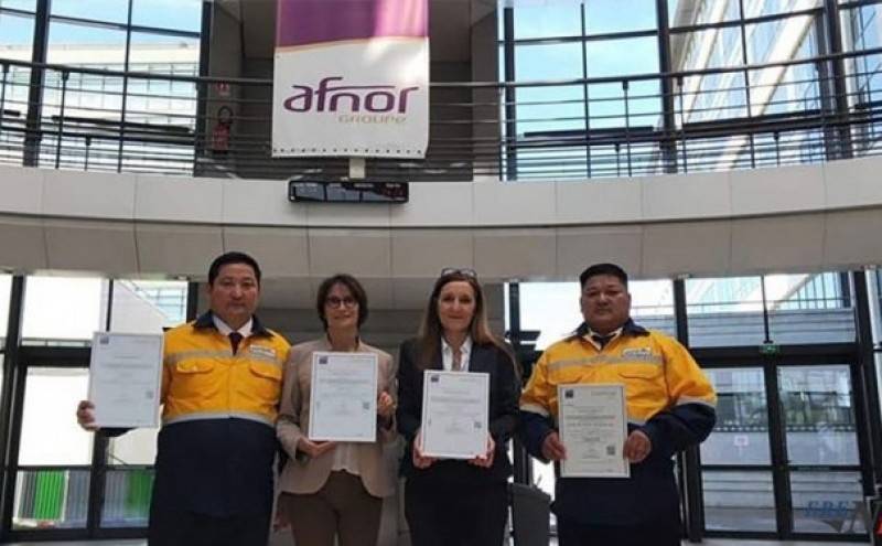 Эрдэнэс-Тавантолгой” ХК нэгдсэн менежментийн тогтолцооны хүрээнд олон улсын ISO стандартуудыг нэвтрүүлж, баталгаажуулалтын гэрчилгээгээ энэ сарын 18-ны өдөр Парис хотноо “AFNOR” группийн Олон улсын бизнесийн Захирал Марьям Аугэрэу Ландесаас албан ёсоор хүлээн авлаа.