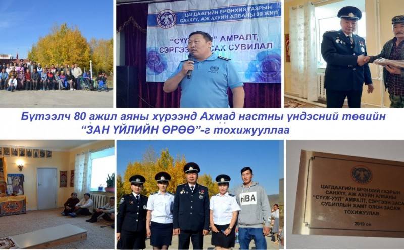 Түүний нэг болох Төв аймгийн Батсүмбэр суманд байрлах "Ахмад настны үндэсний төв"-ийн зан үйлийн өрөөг Санхүү, аж ахуйн албаны “Сүүж-Уул” амралт, сэргээн засах сувиллын хамт олон өөрсдийн нөөц бололцоогоор тохижуулж засварлан хүлээлгэн өглөө.