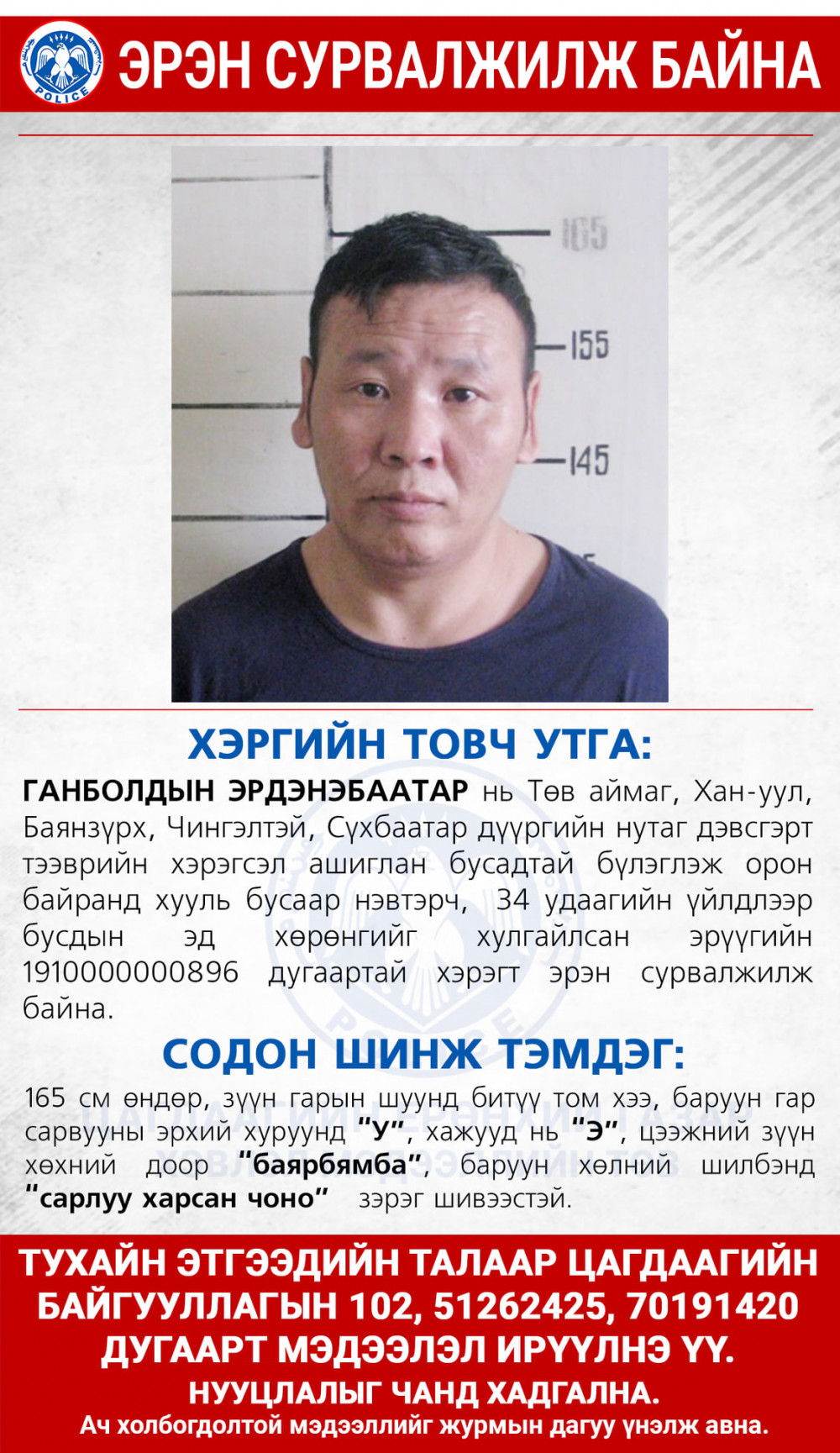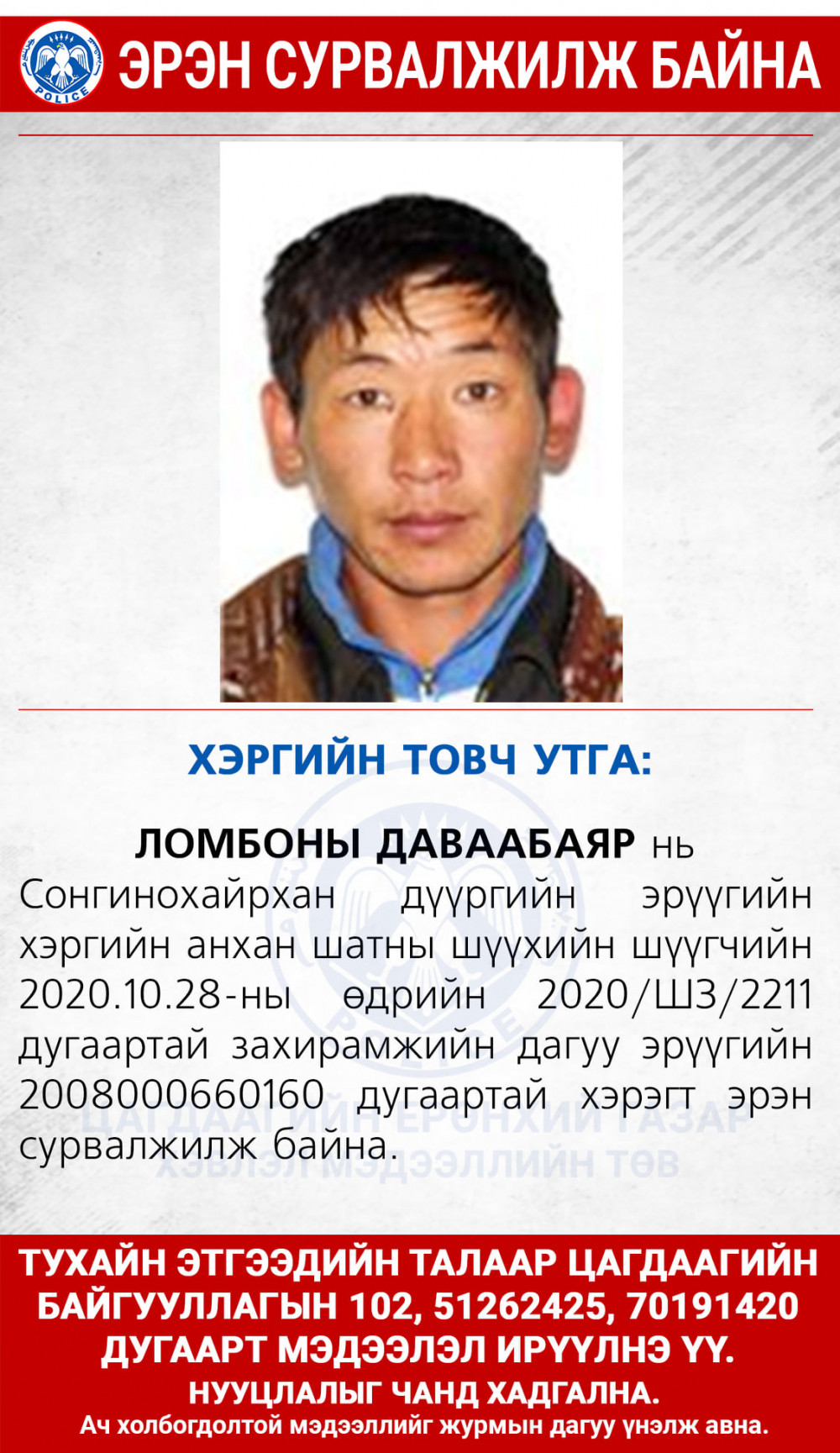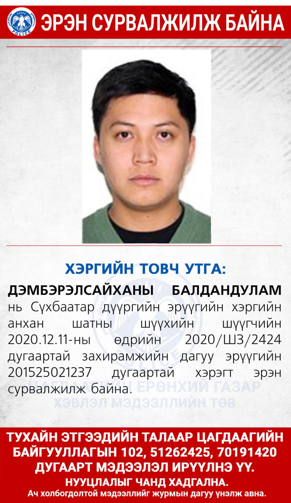 2020/ШЗ/2424 дугаартай захирамжийн дагуу эрүүгийн 201525021237 дугаартай хэрэгт эрэн сурвалжилж байна.