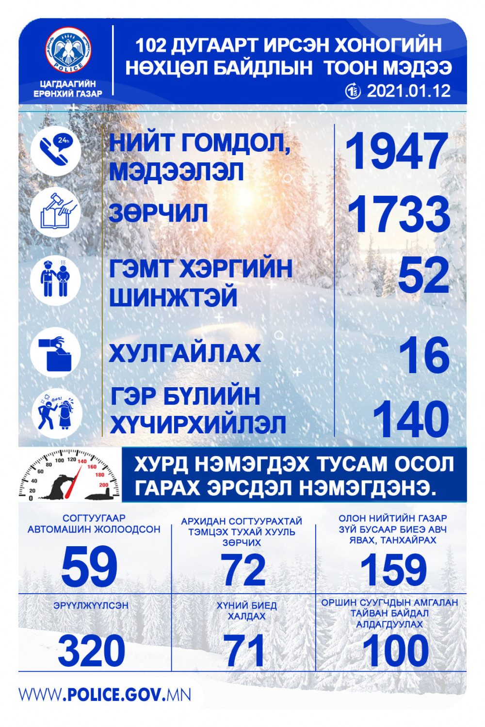 Бүх нийтийн бэлэн байдлын зэрэглэл буурч, өндөржүүлсэн бэлэн байдалд шилжсэнээс архи, согтууруулах ундааны худалдаа хэвийн болсон. ЦЕГ-аас гаргасан мэдээллээр энэ сарын 11-ны өдөр 225 хүн эрүүлжүүлэгдсэн бол өчигдөр 320 хүн эрүүлжүүлэгдэж, гэр бүлийн хүчирхийллийн дуудлага өмнөх өдрийнхөөс хоёр дахин нэмэгдэж 140 болсон байна.