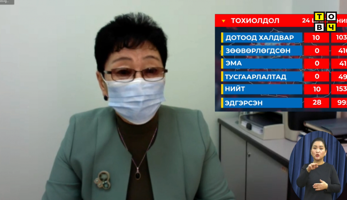 ЭМЯ-наас коронавирусний талаарх ээлжит мэдээллээ хийж байна. ХӨСҮТ-ийн Тандалт, судалгааны албаны дарга А.Амбасэлмаа "Нэгдүгээр сарын 18-ны өдөр улсын хэмжээнд 17,646 хүнд коронавирусийн халдвар илрүүлэх шинжилгээ хийхэд 10 хүнээс халдвар илэрлээ. Бүгд Улаанбаатар хотод бүртгэгдсэн. Эдгээр хүмүүс өмнө нь батлагдсан тохиолдлуудынг ойрын хавьтал бөгөөд тусгаарлан ажиглах байранд тусгаарлагдсан байсан. Ингэснээр дотоодод гарсан кластер өвчлөлийн тоо нийт 1,035, улсын хэмжээнд зөөвөрлөгдөн болон дотоодод гарсан халдварын тохиолдлын тоо нийт 1,536 болсоноос 995 хүн нь эдгэрээд байна" гэлээ.
