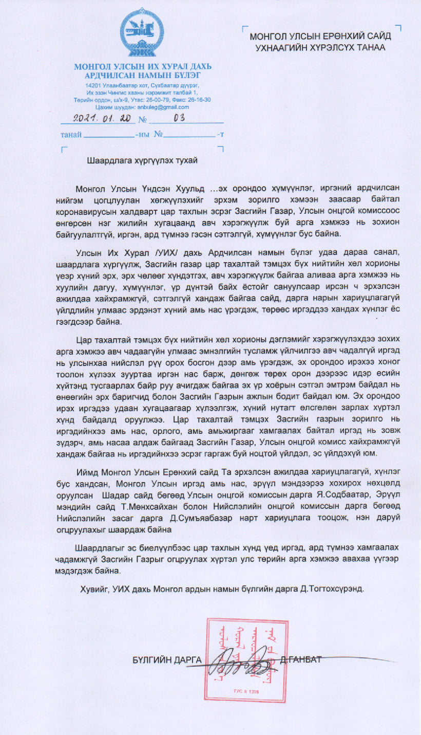 Халдварын тохиолдол илрэх бүрд УОК, түүний шийдвэрийн биелүүлэгч төрийн байгууллагын албан тушаалтнууд иргэдийг буруутгаж, нэр төрд халдсан, ялгаварлан гадуурхдаг ёс зүйгүй үйлдлүүд гаргасаар байна. Үүний нэг жишээ нь дөнгөж төрсөн эмэгтэй нярай хоёрыг шилжүүлэн зөөвөрлөж байгаа явдал. Тиймээс энэхүү харгис үйлдлүүдийнхээ хариуцлагыг хүлээх цаг нь одоо болсон. Иргэд ч цаашид ийм байдлыг тэвчих боломжгүй боллоо гэж үзэж буй.