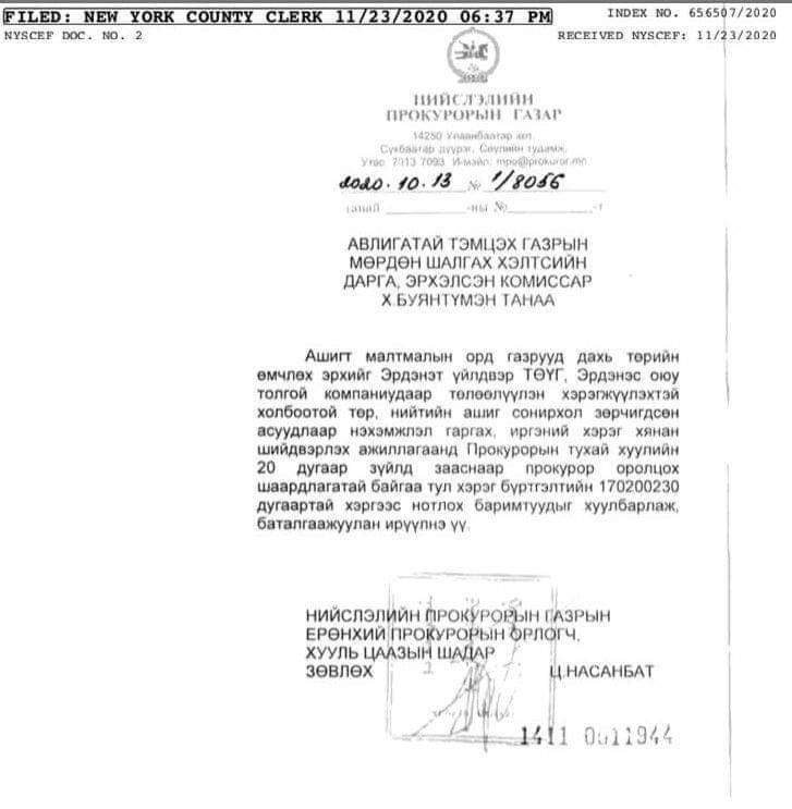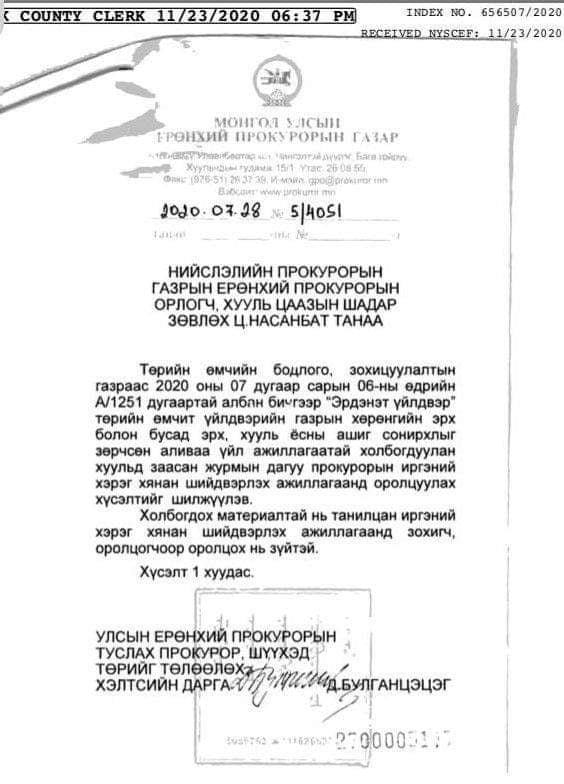 "Нэхэмжлэгч ба хариуцагчид 2020.11.30, 2020.12.22-нд эвлэрч, эвлэрлийг шүүхээс баталгаажуулжээ." Гэвч төрийн нэрийг барьсан хуурамч гомдол гаргасныг Нью-Йоркийн шүүхээс хэргийг Төрийн өмчийн бодлого, зохицуулалтын газар нэрийг хуурамчаар барьж маргаан үүсгэсэн хуулийн компани өөрөө татсан байна. Өөрөөр хэлбэл нэг сайтад бичиж байгаа шиг эвлэрүүлсэн эвлэрсэн зүйл огт байхгүй.