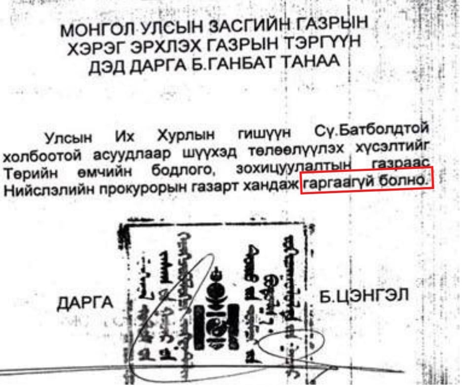 Гэтэл нэг сайт дээр гаргасан прокурор болон АТГ-ын энэ бичигт Батболд гэсэн нэр ч дурдагдаагүй байна. Нэр дурдаагүй, хэнд ямар учиртай хандсан нь ойлгомжгүй бичгээр нэхэмжлэл гаргаагүй гээд байхад нь Төрийн өмчийн бодлого, зохицуулалтын газар нэрийг нь барьж БЗД-ийн шүүхэд хэрэг маргаан үүсгэсэн бол бур ч харин хуурамч, зохиомол хэрэг гэдэг нь нотлогдож байна.